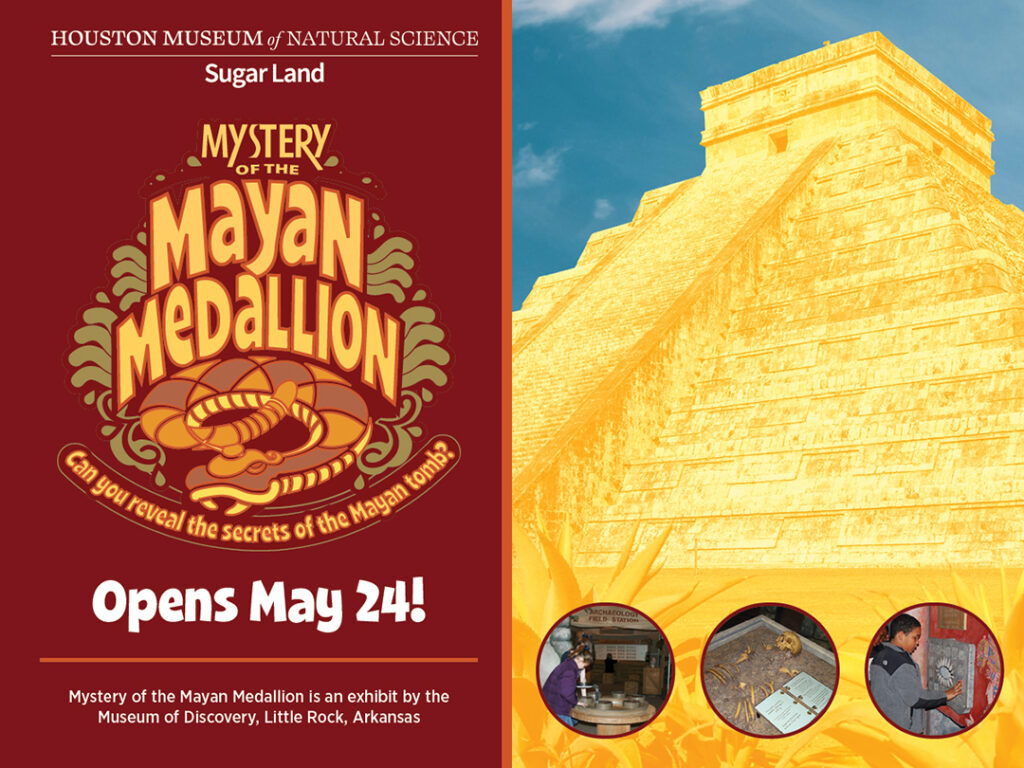 Mystery of the Mayan Medallion is an exhibit by the Museum of Discovery, Little Rock, Arkansas. It will remain at the Houston Museum of Natural Science at Sugar Land through September 2nd, 2024. Visit sugarland.hmns.org for tickets and information.
