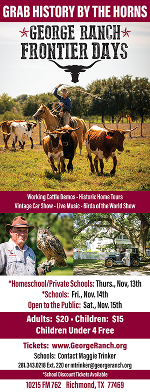 When night falls, adults and children 12 and up are invited to enjoy a spookingly delightful dinner and nighttime walking tour of the Park – complete with stories of ghostly encounters! Advance reservations are required. Reserve your spot by calling 281-343-0218. For more information, visit www.georgeranch.org.