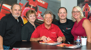 Mario Andretti (center) at Richmond Tire & Automotive with Pat, Mildred, Chris and Callie Shields.